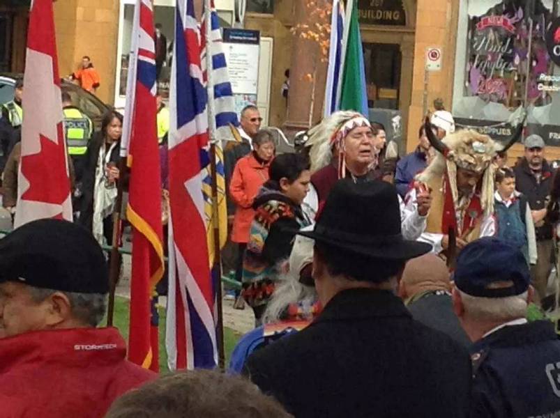 原住民披挂着厚厚的彩色披肩,头上戴着插着羽毛的帽子,偏黑的皮肤.....显得和当地人举办的活动非常不同。他们一群人围着一个鼓敲鼓齐唱深沉古老的歌....还有军人吹小号....然后向纪念碑献上花环.....