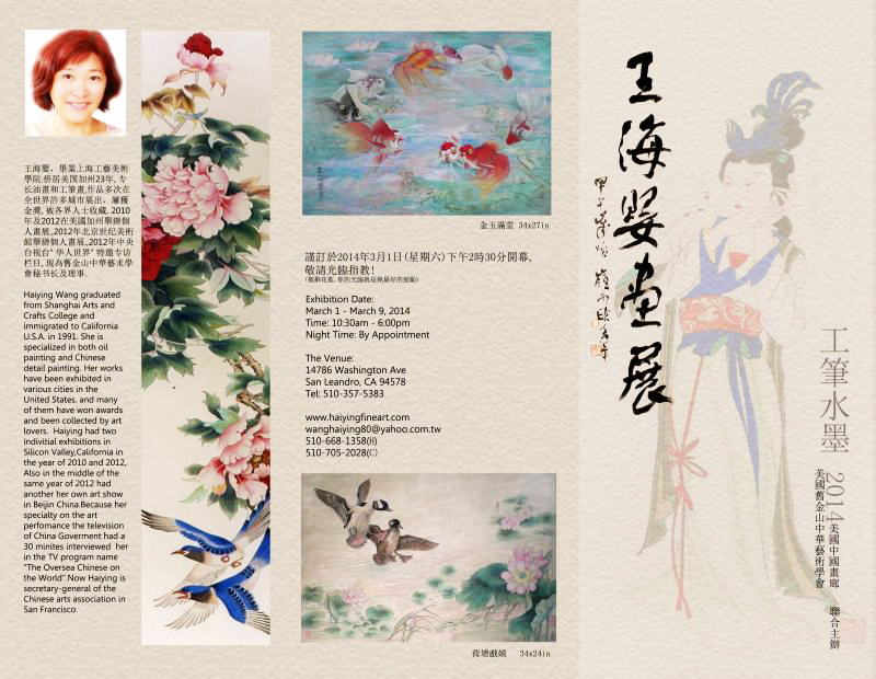 二、王海婴 王海婴(Haiying Wang),毕业上海工艺美术学院,侨居美国加州硅谷已24年,专长油画和工笔画,作品多次在全世界许多城市展出,屡获金奖,被各界人士收藏。 2010年在美国硅谷亚洲艺术中心举办"花情之美"油画个展; 2011年在斯坦福大学艺术空间举办Iris画个展; 2012年在美国硅谷亚洲艺术中心举办"花样年华"油画个展; 2012年在北京蓝润国际艺术中心举办"花之梦"个人油画展; 2012年中央四台"华人世界"栏目特邀专访谈"王海婴花情之梦"; 2013年美国中国画廊举办个展。现任美国旧金山中华艺术学会理事长。