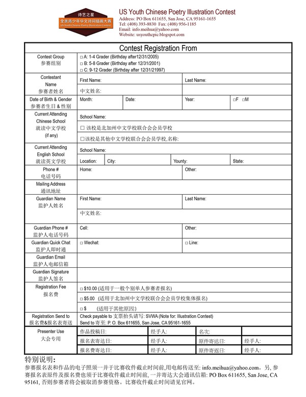 〈诗艺之星-全美青少年华文诗词插画大赛〉 活动比赛报名表 🌟比赛作品制作&报名 詩藝之星插畫大賽-103001 11/14 11652 4.0/1 活动比赛报名表下载: http://www.weidb.co/p31533http://usyouthcpic.weidb.com/p31533 获取作者更多文章 上一页 下一页 1. 〈诗艺之星-全美青少年华文诗词插画大赛〉比赛作品制作&报名方法(19650) 2. 〈诗艺之星-全美青少年华文诗词插画大赛〉 活动比赛报名表 (11652) 上一页 下一页