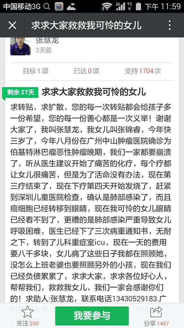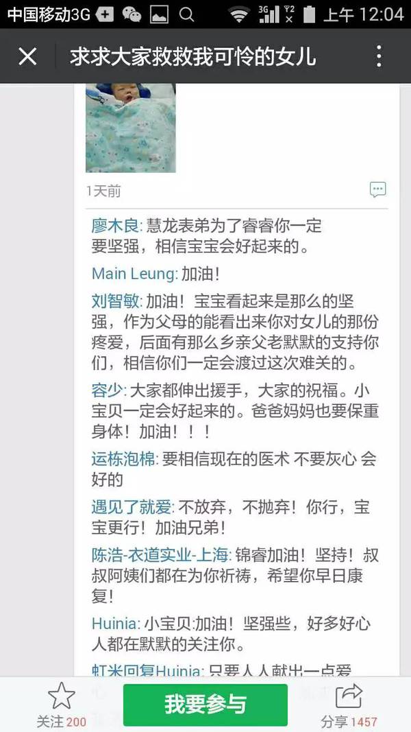 山穷水尽之际,慧龙兄弟前天在一众筹网发出了求助信。一时间,无数水南人的朋友圈、微信群全都在传递着这篇求助信。大家在为小宝贝扼腕同时,即刻就做出了同一决定。