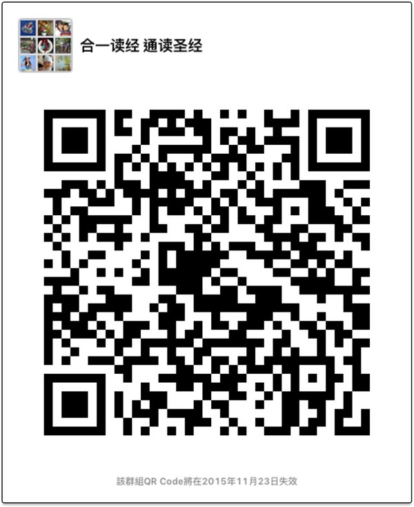 “合一读经通读圣经”微信群是2015年7月29日建立的,当初是汤张贵梅姊妹为了便于网上向她报名参加合一读经小组的弟兄姊妹上报数据而成立。虽然这微信群成立至今还不足四个月,但我们看到上帝对这个“合一读经通读圣经”微信群的大能带领和赐福。感谢上帝。