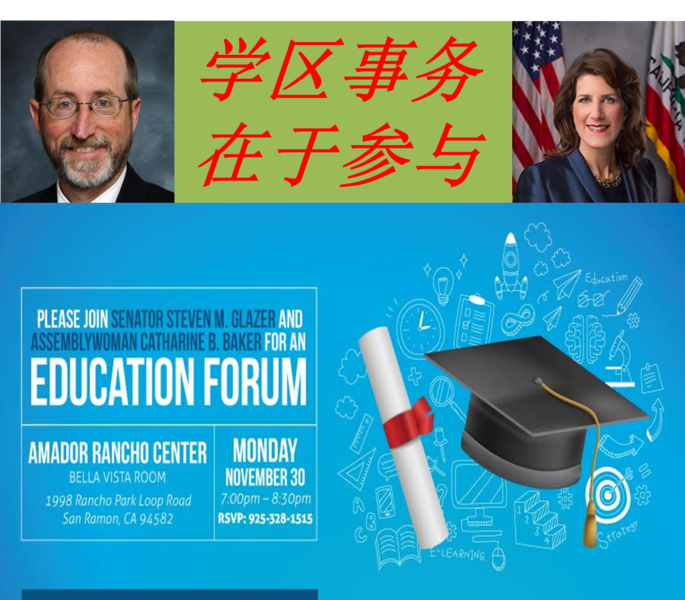 11月30日晚,加州参议员Steve Glazer和众议员 Catharine Baker 将联合跨党派举办一次和民众讨论相关教育立法的见面会。他们会在向大家报告一些相关立法的动态后,自由听取大家意见,并欢迎任何人前往讨论。