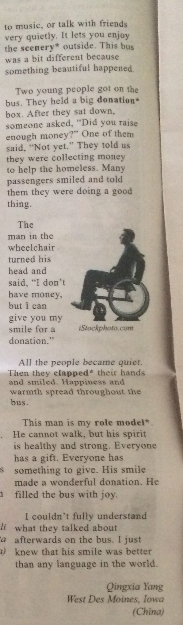 When the bus stopped at Drake University. Two young people got on the bus. They held a big donation box. After they sat down, someone asked, "Did you raise enough money?” One of them said, "Not yet.” They told us they were volunteers, and they were collecting money to help the homeless. Many passengers smiled and told them they were doing a good thing.