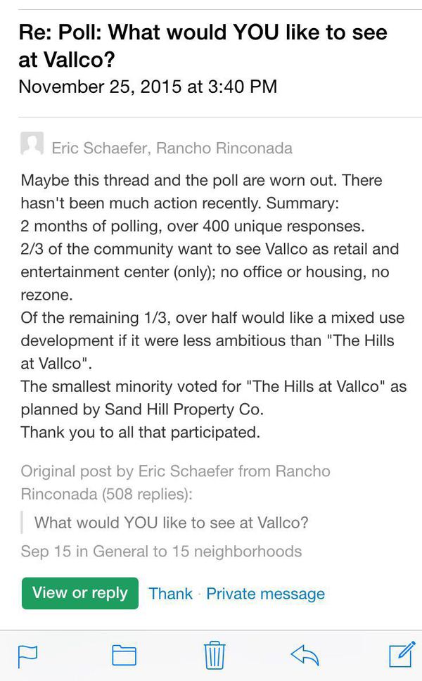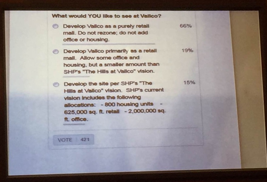 就在昨晚,2015年12月1日,Better Cupertino代表去Cupertino市议会公布了网络民意调查的结果(参考附图),直接戳穿Sand Hill与市府长期以来制造的谎言。Sand Hill号称已经与市民沟通了很多个月,他们的Vallco计划完全是吸取了广大库市居民意见才提出来的。可是,看文后附图,大家可以看到Sand Hill寄给库市居民的所谓“民意调查表”,结尾反馈栏只有一个选项,那就是:I support The Hills at Vallco。对于持有反对意见的居民,Sand Hill根本不不给他们任何说话的机会。