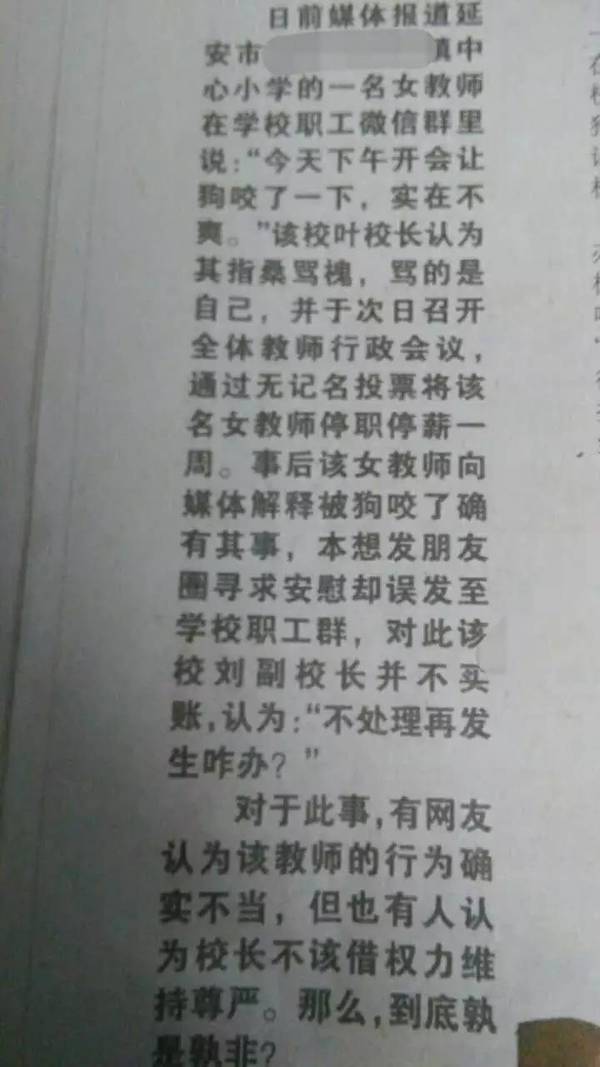 个人认为老师既没被狗咬也不是发错群了。可能那天她遇到什么不顺心的事(其实即使没什么外因,任何人一个月也总会有几天情绪波谷。),把情绪带到了会场,既忘了带记录本又没受住校长当众批评,一时火起率性闯“祸”。