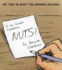 Bastogne 首当其冲。当时几千名 101 空降师的将士驻守在这里,迅即被几万德军团团包围。德军送出最后通牒,师长 McAulliffe 将军在纸上只写了一个词:Nuts!(中文的“呸”)交回。后来,虽付出重大代价,Bastogne 却一直在几倍于己的包围中,牢牢守住。在孩子听得都快呆掉的时候,我乘机教育他们:如果想做成一件事,首先要有战斗的意志和必胜的信心。