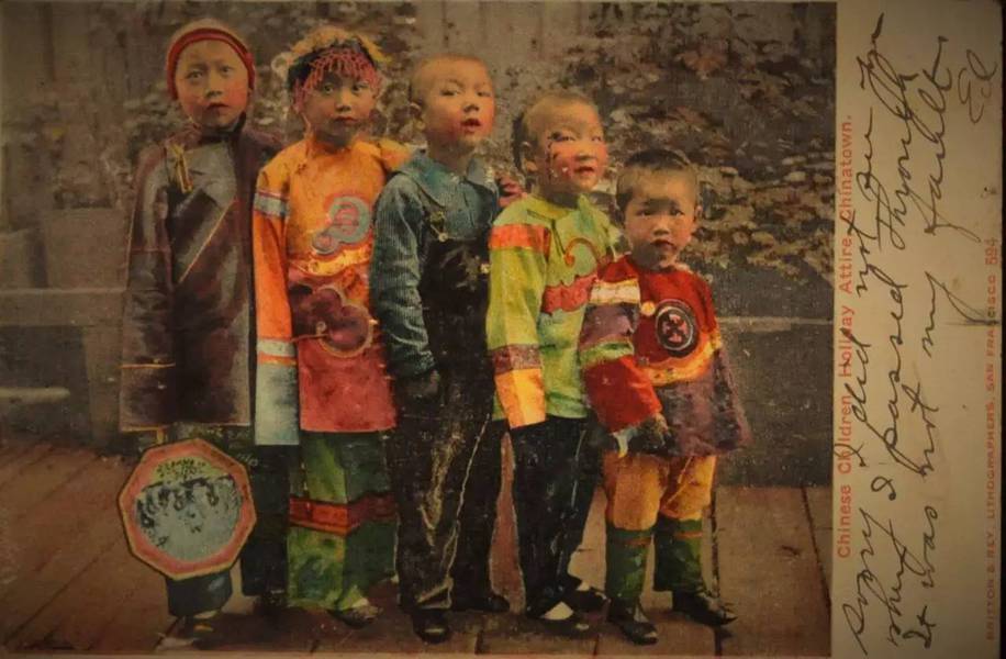 - 76. (明信卡 5) 三藩市唐人街兒童節日盛裝合照,照片攝於1901-1907期間,展示中國清未時期兒童服飾。林凱斌藏(70551)