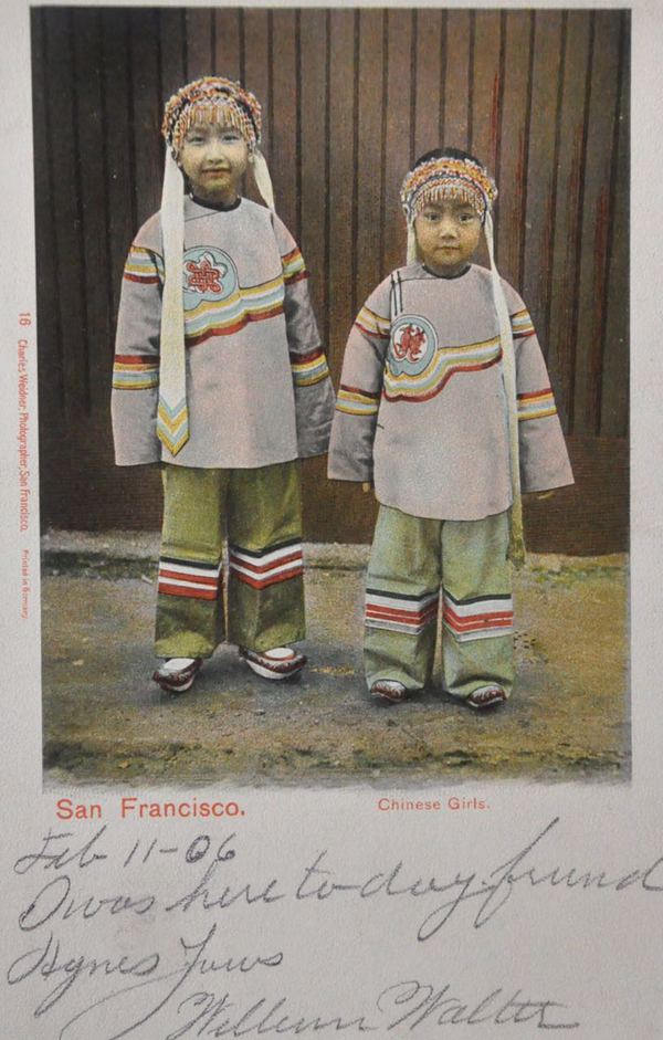 - 268. (明信卡 7) 三藩市二位華裔女童節日盛裝照,清未服飾。(1906年郵戳) 林凱斌藏(68900)