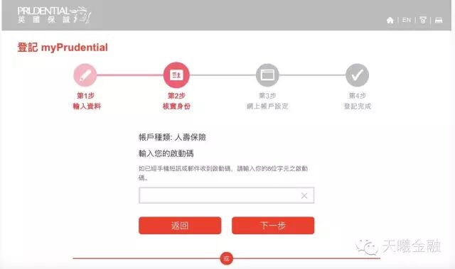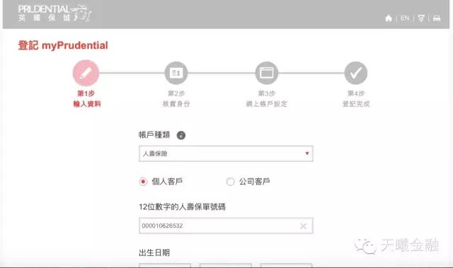 3. 帐户种类请选择“人寿保险”,填入您名下任何一张保单的号码,填入出生日期和身份证号码(国内客户请填入中国身份证号码),点击下一步。