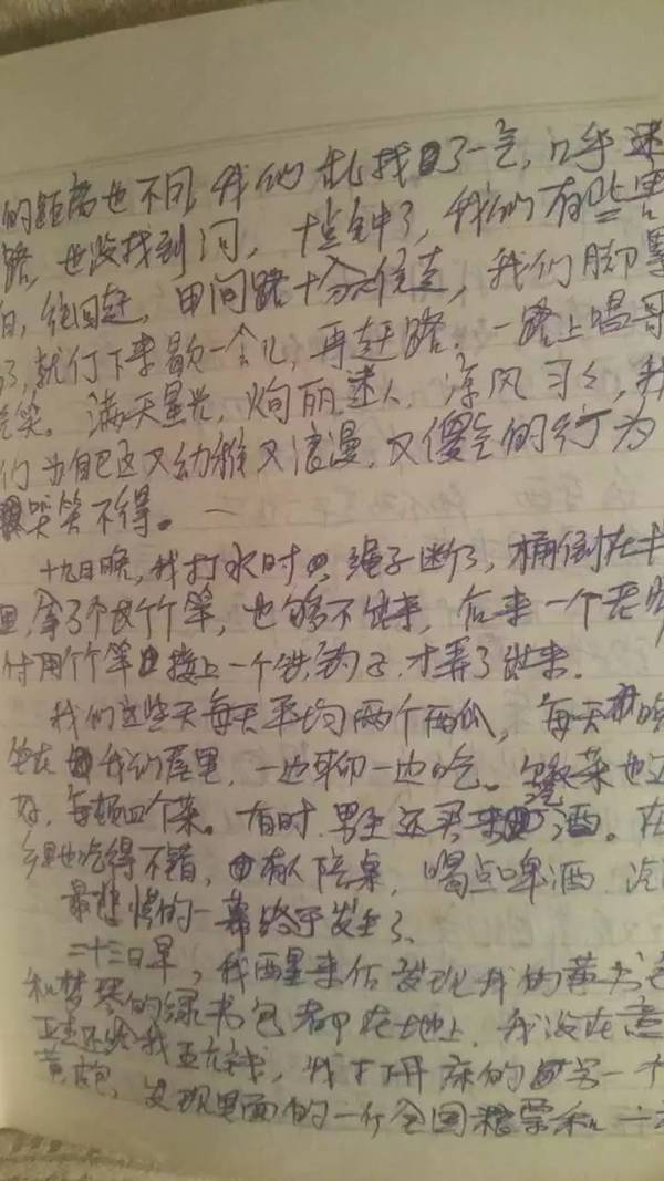 十八日晚,在梦琴的提议下,我们一起出去找河洗澡。天很晚了,我们一边问路一边走,走了好远也没找到河。几个路人指的方向不同,说的距离也不同。我们乱找了一气,几乎迷了路,也没找到河。十点钟了,我们有些害怕,往回赶。田间路十分难走,我们脚累痛了,就停下来歇一会儿,再赶路。一路上唱歌说笑。满天星光,炫丽迷人,凉风习习。我们为自己这又幼稚,又浪漫,又傻气的行为哭笑不得。