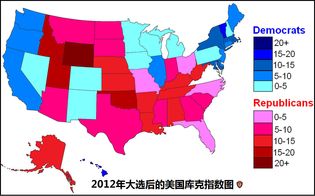 库克政党投票倾向指数的具体计算公式是:将选区内民主党/共和党在过去两届总统选举中的平均得票率,与民主党/共和党在过去两届总统选举中的全国得票率平均值作比较出的指数。