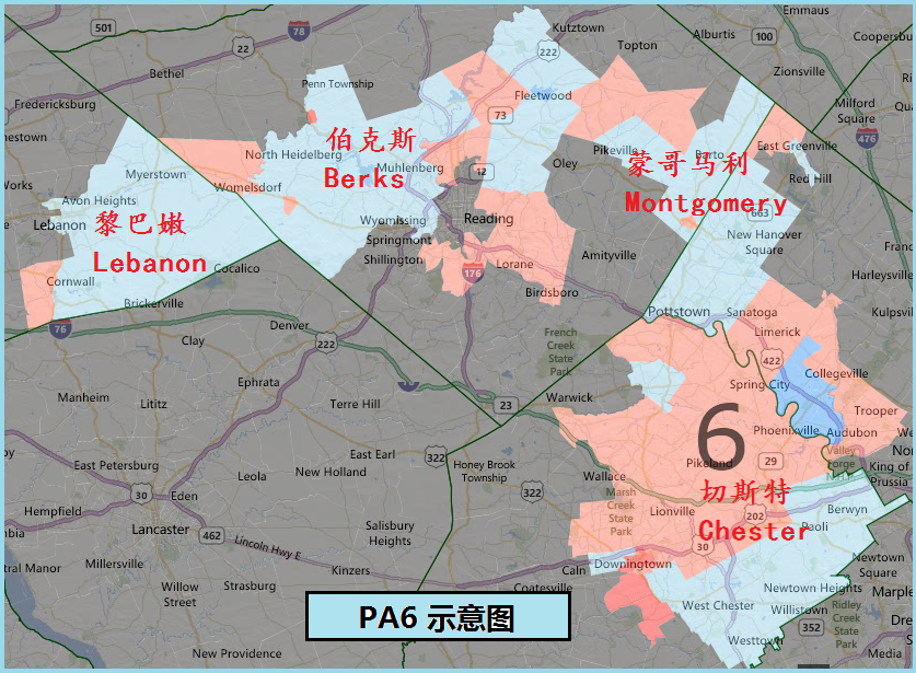 位于PA6区或附近的郡:Counties in (or near) Pennsylvania's 6th Congressional District: | 伯克斯(Berks County), 切斯特(Chester County), 黎巴嫩(Lebanon County),蒙哥马利 (Montgomery County)。 |
