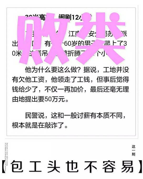 刚刚稍得闲看了下新闻得知,有个老农民工,在小包包按诺付清工资后,事隔多日,却又凭空狮子大开口,爬上塔吊“讨薪”50万元钱,耗费了巨大公众资源才得以解决。