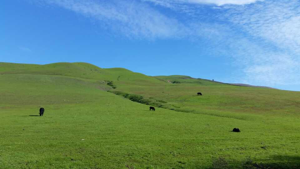 停车路边,沿着山脚的公路慢慢地往上走。蓝天,白云,煦阳,柔风。山冈上的新绿让人如此心醉,牛儿悠闲地吃着草,远处的一群马儿嘶叫着欢快地相互追逐。。。