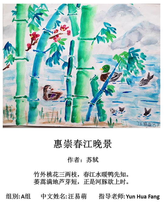 〈诗艺之星—诗词插画大赛〉新件到达:汪易萌 🌟活动消息 社区活动 亲子教育 心灵鸡汤 人生点滴 詩藝之星插畫大賽-103001 02/05 29080 4.7/3 【活动消息: 新件到达: 汪易萌】 亲爱的参赛者、家长、老师和朋友: 很高兴A组又收到1件参赛作品,作者是: 汪易萌。祝福参赛者创作快乐,参赛开心,收获无穷。想要了解更多作品详情,请进入活动网站的「Artwork Portfolio: Group A」栏目浏览。 欲知其它更多活动相关详情,欢迎随时与活动执委会联系,或可至活动网站查看: Tel: (408) 393-8830; Email: info.ecoheartsociety@yahoo.com; Facebook: https://www.facebook.com/usyouthcpic/; Wechat Website: http://www.weidb.com/g6962; Website: http://usyouthcpic.blogspot.com/。 http://weidb.co/p37579http://usyouthcpic.weidb.com/p37579 获取作者更多文章 上一页 下一页 1. 〈诗艺之星—诗词插画大赛〉: 获奖作品专辑即将出炉!(31096) 2. 〈诗艺之星—诗词插画大赛〉: 评审的祝贺语: 张伟民(26931) 3. 〈诗艺之星—诗词插画大赛〉: 评审的祝贺语: 朱立立(29916) 4. 〈诗艺之星—诗词插画大赛〉: 评审的祝贺语: 海云(29363) 5. 〈诗艺之星—诗词插画大赛〉: 评审的祝贺语: 王海婴(23283) 6. 〈诗艺之星—诗词插画大赛〉: 各组获奖名单出炉了!(26551) 7. 〈诗艺之星—诗词插画大赛〉:活动执委会的话: 祝贺及说明(22446) 8. 〈诗艺之星—诗词插画大赛〉: B组入围名单出炉了!(25652) 9. 〈诗艺之星—诗词插画大赛〉: A组入围名单出炉了!!(25029) 10. 〈诗艺之星—诗词插画大赛〉:网路投票专区今日上线了! (41503) 11. 〈诗艺之星—诗词插画大赛〉新件到达:Elaine Jiang(29721) 12. 〈诗艺之星—诗词插画大赛〉新件到达:裴衍瑾(32345) 13. 〈诗艺之星—诗词插画大赛〉新件到达: 銭如欣(30954) 14. 〈诗艺之星—诗词插画大赛〉新件到达: 銭如贝(29069) 15. 〈诗艺之星—诗词插画大赛〉新件到达:张德倫(28748) 16. 〈诗艺之星—诗词插画大赛〉新件到达:陈卓立(29524) 17. 〈诗艺之星—诗词插画大赛〉新件到达:高愷琳(28797) 18. 〈诗艺之星—诗词插画大赛〉新件到达:汪易萌(29080) 19. 〈诗艺之星—诗词插画大赛〉新件到达:刘雅靖(28885) 20. 〈诗艺之星—诗词插画大赛〉新件到达:李方熙(27786) 21. 〈诗艺之星—诗词插画大赛〉新件到达:梁晨熙(27647) 22. 〈诗艺之星—诗词插画大赛〉新件到达:江信为(27931) 23. 〈诗艺之星—诗词插画大赛〉新件到达:黃麒兴(27540) 24. 〈诗艺之星—诗词插画大赛〉新件到达:董果果(28666) 25. 〈诗艺之星—诗词插画大赛〉新件到达:徐海恩(28686) 26. 〈诗艺之星—诗词插画大赛〉新件到达:崔博雅(28694) 27. 〈诗艺之星—诗词插画大赛〉新件到达:张亞杰(28799) 28. 〈诗艺之星—诗词插画大赛〉新件到达:邓泽恩(29445) 29. 〈诗艺之星—诗词插画大赛〉新件到达:陈凱文(29041) 30. 〈诗艺之星—诗词插画大赛〉活动办法:比赛规则大纲(17459) 31. 〈诗艺之星-全美青少年华文诗词插画大赛〉活动评委简介(16348) 32. 〈诗艺之星—诗词插画大赛〉新件到达:黃可欣(28178) 33. 〈诗艺之星—诗词插画大赛〉新件到达:何泓道(28066) 34. 〈诗艺之星—诗词插画大赛〉新件到达:何泓毅(27938) 35. 〈诗艺之星—诗词插画大赛〉新件到达:张芷菲(28101) 36. 〈诗艺之星—诗词插画大赛〉新件到达:胥舒怡(28378) 37. 〈诗艺之星—诗词插画大赛〉新件到达:刘岳青(27003) 38. 〈诗艺之星—诗词插画大赛〉新件到达:徐菲菲(28179) 39. 〈诗艺之星—诗词插画大赛〉新件到达:李安娜(28629) 40. 〈诗艺之星—诗词插画大赛〉新件到达:李红森(13031) 41. 〈诗艺之星—诗词插画大赛〉新件到达:张倚雯(23956) 42. 〈诗艺之星—诗词插画大赛〉新件到达: 潘欣霏(22229) 43. 〈诗艺之星—诗词插画大赛〉新件到达: 韩叶(22265) 44. 〈诗艺之星—诗词插画大赛〉新件到达:张芷华(22395) 45. 〈诗艺之星—诗词插画大赛〉新件到达:陈家扬(20176) 46. 〈诗艺之星—诗词插画大赛〉新件到达:陈天安(20071) 47. 〈诗艺之星—诗词插画大赛〉新件到达:裴伊娃(20109) 48. 〈诗艺之星—诗词插画大赛〉新件到达:陈家睿(20171) 49. 〈诗艺之星—诗词插画大赛〉新件到达:董诗雯(20360) 50. 〈诗艺之星—诗词插画大赛〉新件到达:王乐文(20875) 上一页 下一页