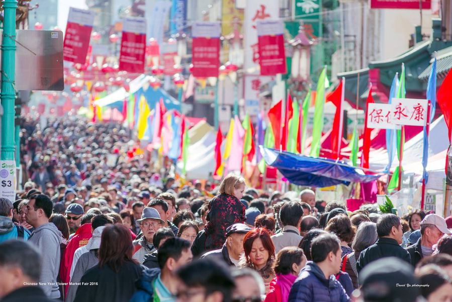 三藩市華人新春期間有二大盛會。 一是花市, 二是新春遊行, 今年花市在人山人海的盛況下, 余氏透過局部對焦, 突出穿红衣的女孩。