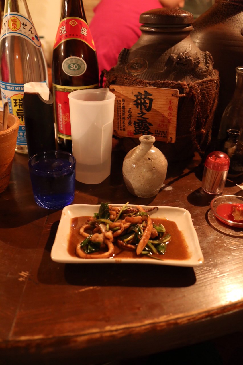注意看看它的装修,看看吧台,看看老板的厨房,是不是和山村野店没有什么区别?对了,我最喜欢的一道菜,是照片上拍出来的,那一碟章鱼炒青菜,味道苦苦的,却非常清爽的风格,和这小小的居酒屋相得益彰。不过,这道菜并非每天都有哟,老板说要根据送菜公司的情况。不过,老板知道我们喜欢,就特意在我们最后一天,为我们订购了配料,而且,给我们炒了好大一盘。