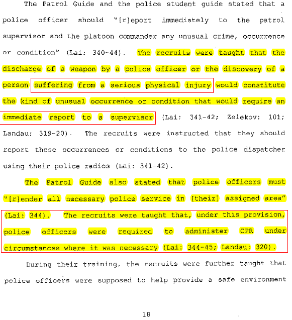 Landau警官供认NYPD在训练CPR 时候极其马虎并在结业时作弊,梁警官CPR培训时的同僚也提供类似供词。梁警官供认自己根本没有读过持枪安全的培训手册,再次证明NYPD完全没把自己训练合格,却排到一个最危险的地方黑暗中垂直巡逻。
