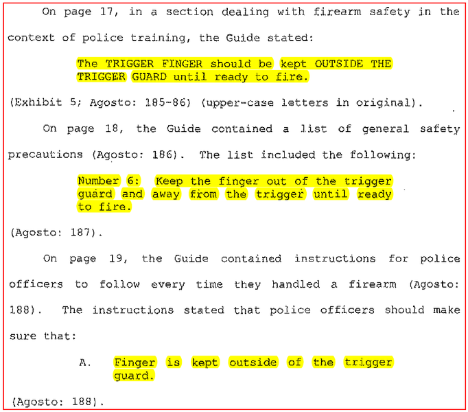 a problem.’” 按:这里不是很清楚梁是指这几百次都是和发生事故这次一模一样操作,也就是说他几百次都把指头放在扳机上,还是说几百次都持枪巡逻而已。但从他最后加上的 “There’s never been a problem”这句强调来看,他多半指他几百次都把指头放在扳机上,因为如果仅仅是持枪巡逻而不把指头放在扳机上,本来就不会有什么“problem”)。无论如何,梁自己提供了证据他很可能不懂持枪安全。如果检方不能提供反证,比如NYPD定期考核梁的安全知识,那么检方没有meet the burden of proof。梁作为上岗时间很短的新手,可能从上岗起就没有接受过定期考核。现在没有 trial transcript,无法得知梁的律师曾经从这个角度进行辩驳,从而有上诉机会。