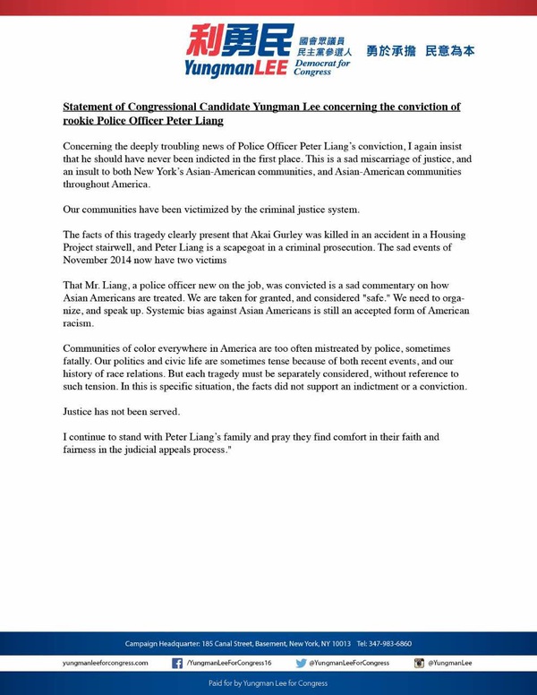 对于近日令人深感不安的梁彼得警官罪判消息,我再一次坚持:从一开始他就不应被起诉。这是一个不幸的误判和对纽约的亚裔美国人社区及遍布全美的亚裔美国人社区的侮辱。