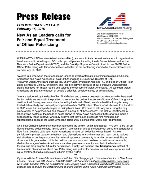 WASHINGTON, DC — New Asian Leaders (NAL), a non-profit Asian American leadership organization headquartered in Washington, DC, calls upon all parties, including the de Blasio Administration, the New York Police Department (NYPD), and the Brooklyn Supreme Court to treat former NYPD Police Officer Peter Liang with fair and equal consideration in the sentencing round after the verdict rendered on February 12, 2016.