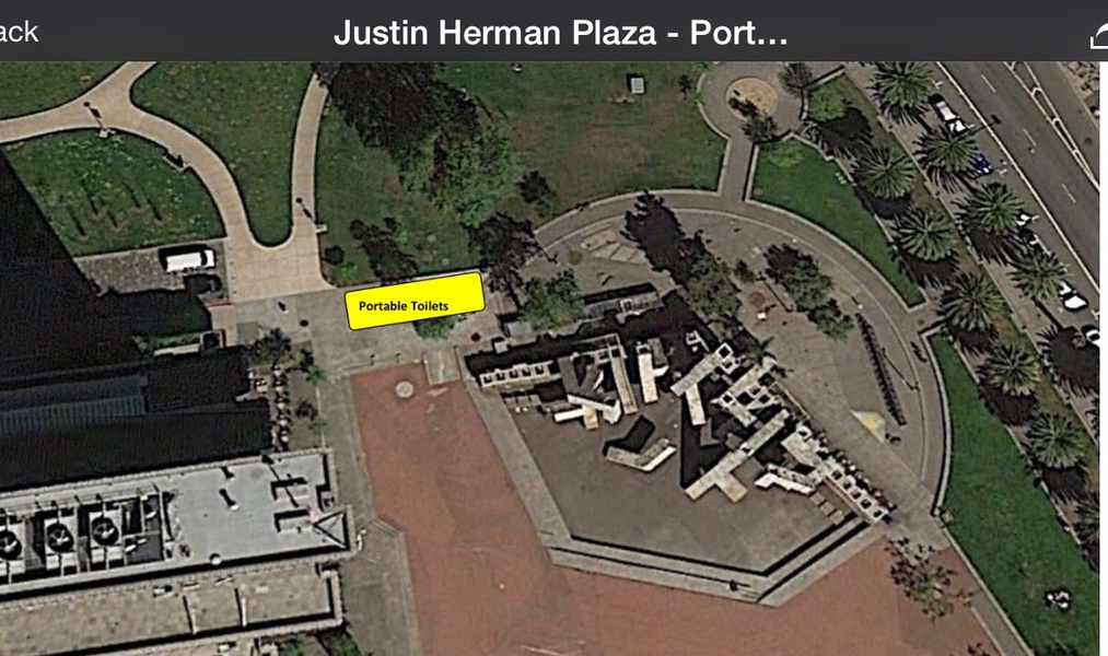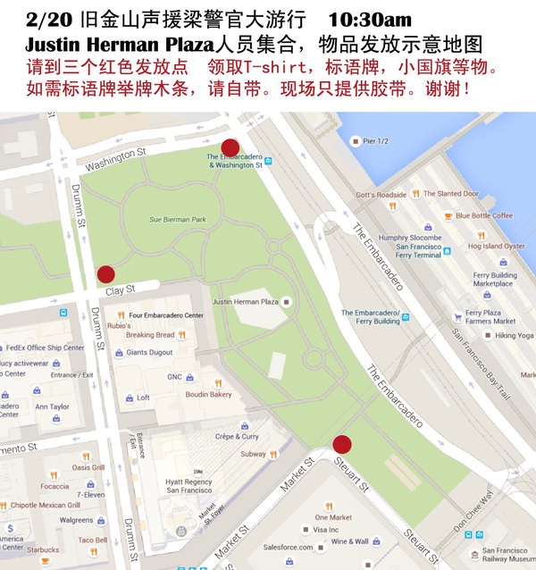 10:30am-11:00am 在Justin Herman Plaza集合。等候期间,群众领取T shirt,标语牌,美国小国旗等物品。流动厕所位置见附图。
