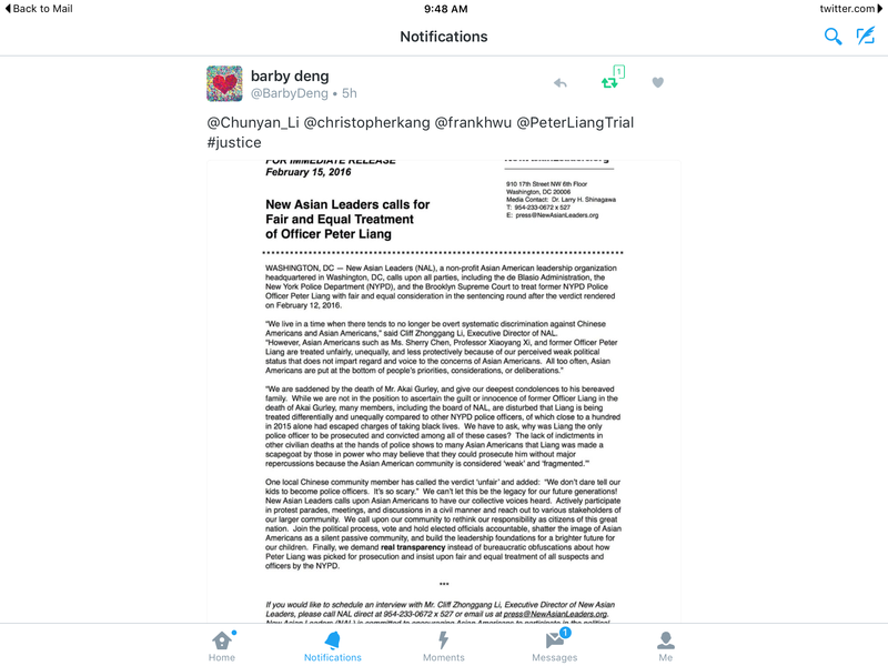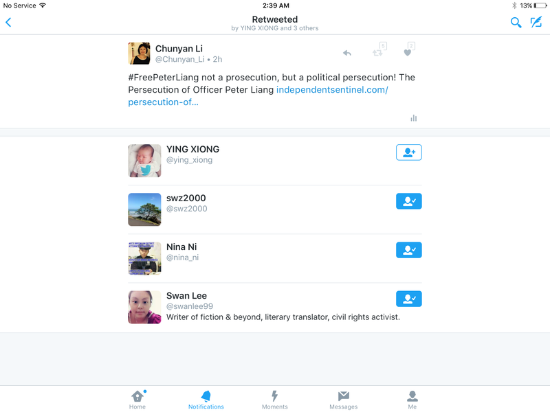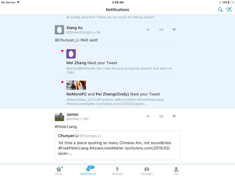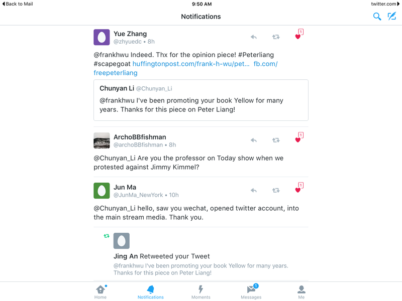 别只在微信群里转,去YouTube上留言并顺便给已经在那儿发言的朋友点赞. 这位女孩儿has an honest soul--one comment said. 请转到FB/Twitter。有Twitter帐号的加@Justice4Liang @Chunyan_Li,可以直接转发很多tweets with hashtags.