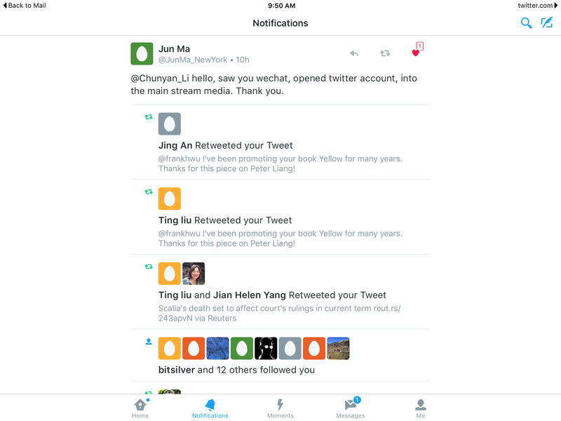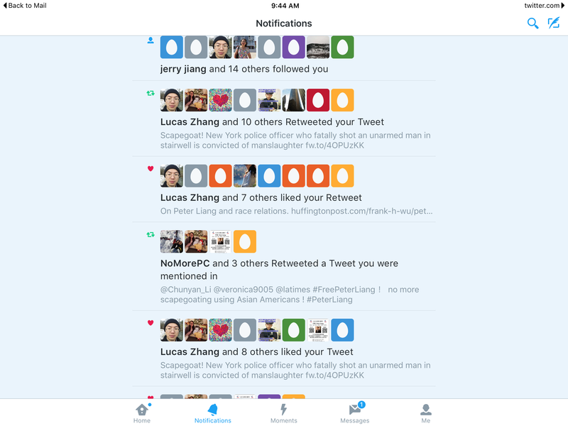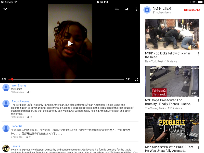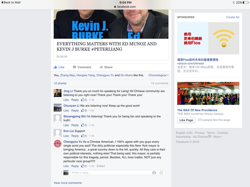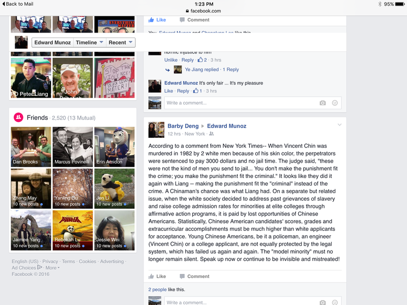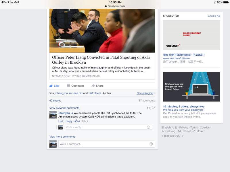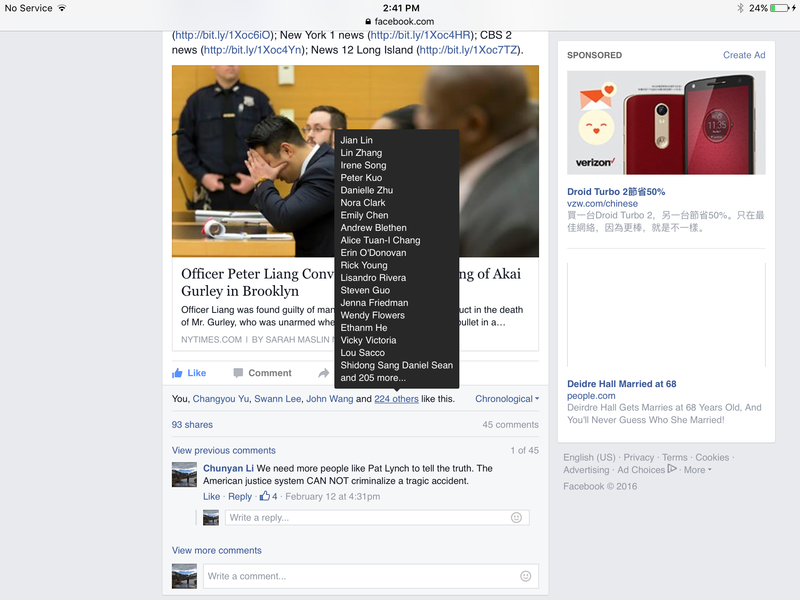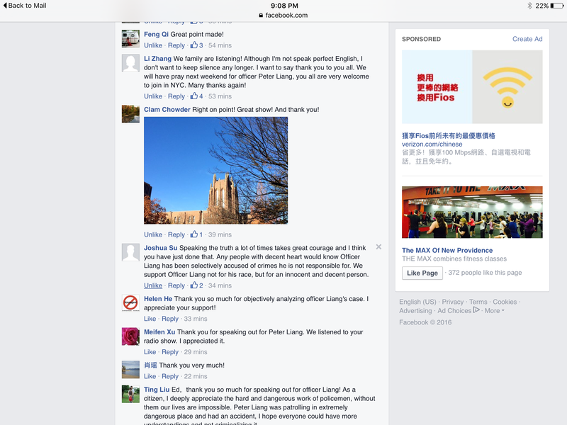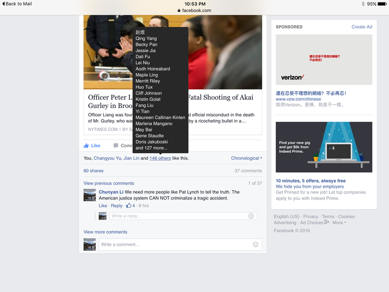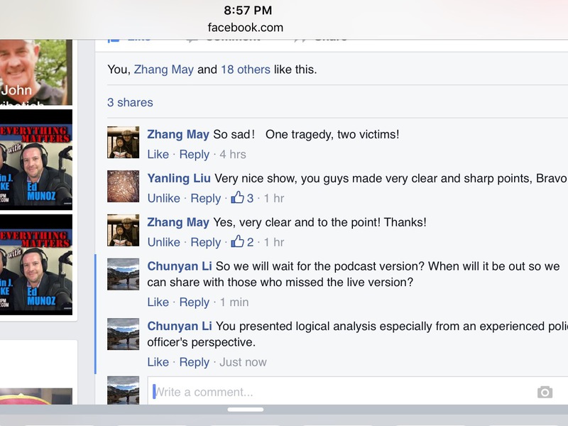 几天来华人在英文网络上活动频繁,虽然还远远不如微信,也是不少变化了。希望更多华人能在微信对内同时,到更广的世界驰骋。尤其那个非裔女孩视频,我发评论时只有三百多赞,现在已经两千多赞,超过二万三views了。我更抽时间给发言的朋友点赞,互相扶持,才能声音传播更广。两位退休警察主持的关于梁警官事件的分析也在Facebook上得到大量华人反馈。