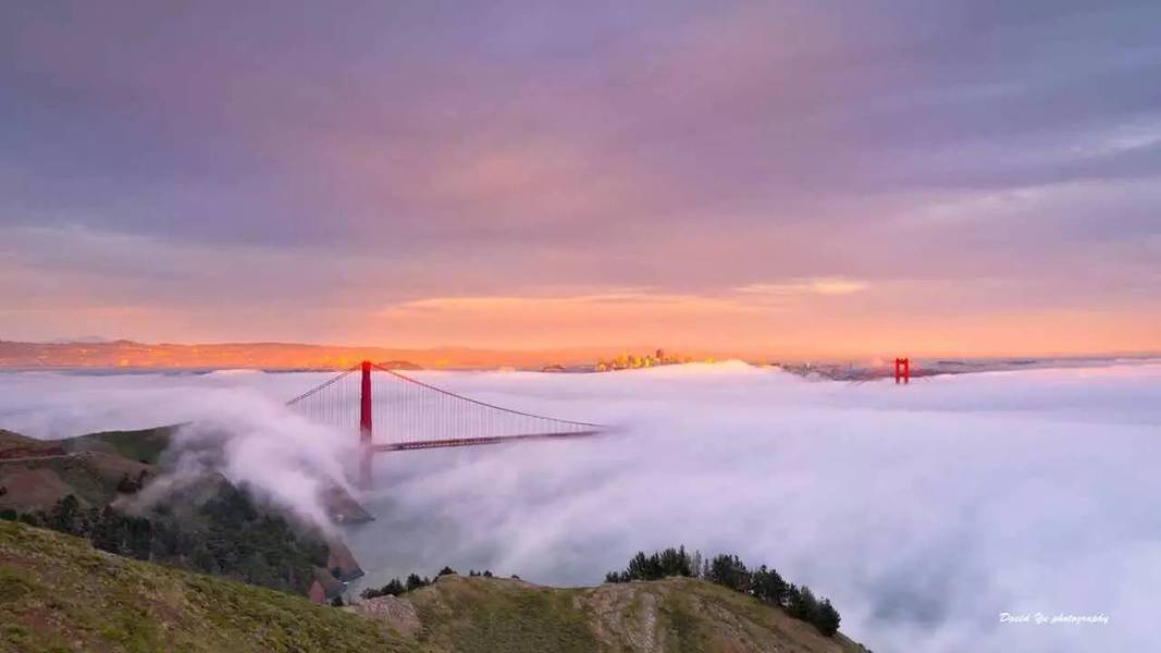 拍攝金橋最佳角度位於橋彼面Marin County 的 Hawk Hill山丘, 這一幅余氏在日落時剛好雲海壓顶, 天色未全暗的一刻佳境拍下。
