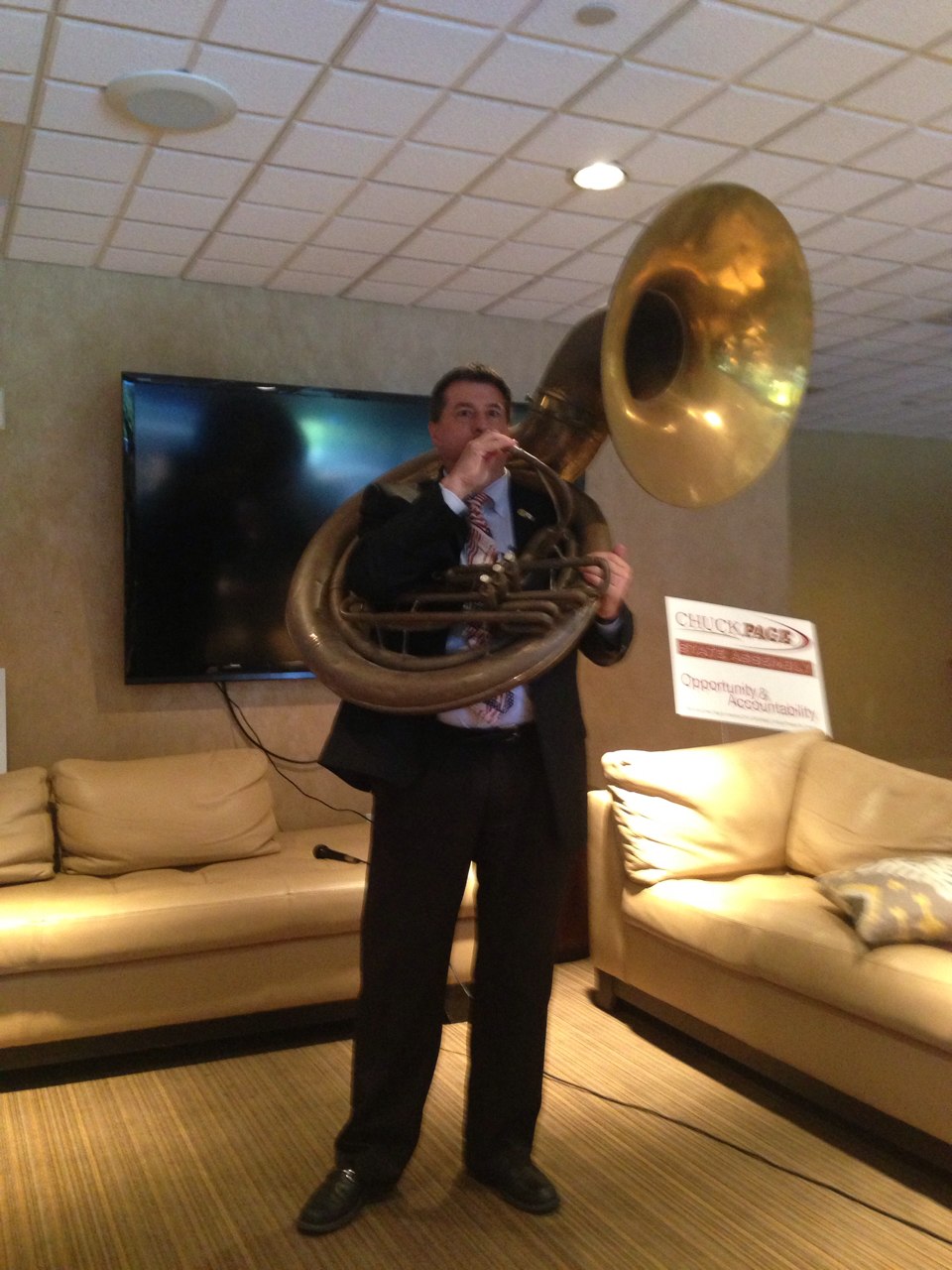 当我们以为本次活动即将圆满结束的时候,Chuck 从地上举起了一个超大的家伙,天哪,原来那不是一个decoration用的家具? 他以健硕的体魄扛起这个Sousaphone,给大家吹了一曲。当天晚上,我听见George Young轻轻松松引吭高歌万里长城永不倒,深深体会到不会卡拉OK的白人拉华人票的艰辛。