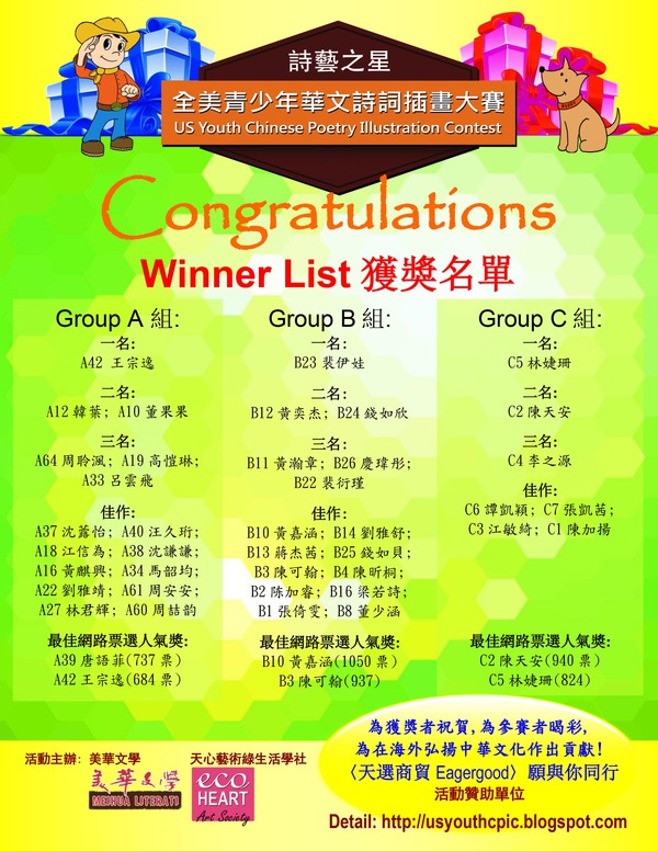 经过一周的审慎排序,五位评审最终提出的《诗艺之星—全美青少年华文诗词插画大赛》各组的获奖名单如下,祝贺这39位获奖者。现在,让我们一起携手合作,朝向颁奖典礼、纪念专辑编印,以及纪念专辑发布会的筹备工作迈进!