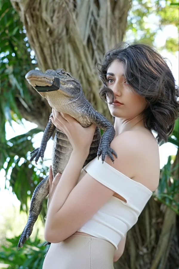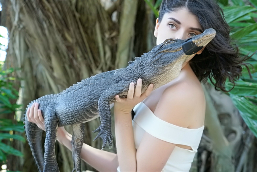 下边是模特五的素颜照,釆访照,造型照,我也喜欢她的气质有一种楚楚可怜的动人,有幸我也有和她的合影,她和我弟弟阿正还有自拍,放上来欣赏,她是唯一一个敢亲吻鳄鱼皮肤的美女