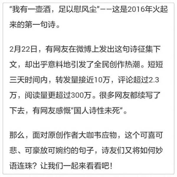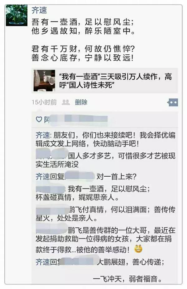 微信發文利器WeiDBcom,點這裡開始!👉👉【我 有 一 壶 酒(1)】(编辑:齐速) 🌟亲子教育 🌟人生点滴 齐速-101392 03/08 17403 4.0/1 2016.2.9晨 微信發文利器WeiDBcom,點這裡開始!👉👉 http://www.weidb.co/p41117 获取作者更多文章 上一页 下一页 1. 【海绵人✳️微云影视剧】剧情构思素材记录💠初稿花絮✨讨论解析(27239) 2. 《芳菲岁月》- 二月冰梦 | 武昌起疫(99297) 3. 《抗击武汉疫情募捐倡议书》 ~美國長安聯誼會(48613) 4. 虞美人·歲暮抒懷(63479) 5. 詩集《邂逅詩歌》(39999) 6. 五律二首(41033) 7. 南瀛三月社課(28051) 8. 肥哥之友•富贵病(58636) 9. 如果没有万圣节😱(65046) 10. 肥哥天地•MIT银桶(60502) 11. 二十九封書信及後續篇(35841) 12. 文革中北大清华的死亡事件(13328) 13. 肥哥天地•Dr. Vera Rubin(21848) 14. FIT36(36分钟高效健身)-- 不一样的健身经历(26030) 15. 7 things emotionally intelligent people avoid(20850) 16. Difference in decision making and competence(17333) 17. Trump,农妇,蛇(27629) 18. 眾志拳拳 愛心暖人間(26686) 19. From Good To Great(17689) 20. 【寡 言 的 父 亲】——献给所有农民工的留守父亲(作者:老茂)(24024) 21. 太极点滴(35624) 22. 🌸♬《芙蓉雨》(17871) 23. @《当你老了》(14712) 24. 汪浩:寻人启事(译)(35635) 25. 汪浩:威斯敏之静谧 - 圣詹姆士公园游记(36532) 26. To Elle - My Puppy Friend(28076) 27. Second Sunday of May(30993) 28. 英子读诗【四月女人】(24013) 29. 湿瓷绘《一啄一声响》俳句连歌(18292) 30. 【农民工-远行 】/【农民工-苦楚】 (作者:齐速)(24929) 31. 北美华人医师联盟(ANACP)讲座通知(33478) 32. 春天的早晨(20210) 33. 【我 的 文 盲 母 亲】——献给所有农民工的留守父母亲(作者:老茂)(20676) 34. 人的一生,注定要经历很多(13419) 35. 【生活组诗:吃 喝 拉 撒】(作者:齐速)(17616) 36. 【生活组诗:刷 牙 洗 脸】(作者:齐速)(24056) 37. 【远方的家远方的你】(作者:齐速)(24822) 38. 轻沉兼备(16507) 39. 〈诗艺之星—诗词插画大赛〉: 获奖作品专辑即将出炉!(31054) 40. 〈诗艺之星—诗词插画大赛〉: 评审的祝贺语: 张伟民(26904) 41. 〈诗艺之星—诗词插画大赛〉: 评审的祝贺语: 朱立立(29872) 42. 〈诗艺之星—诗词插画大赛〉: 评审的祝贺语: 海云(29334) 43. 达哥:清明忆外婆(22233) 44. 肥哥之友•背影(19212) 45. 關於新書(18618) 46. 有感落英(18029) 47. 川普 · 言论自由 · 领导能力(29426) 48. 【我 有 一 壶 酒(1)】(编辑:齐速)(17403) 49. 肥哥天地•才女无数(17979) 50. 肥哥之友•飚诗三月(17493) 上一页 下一页