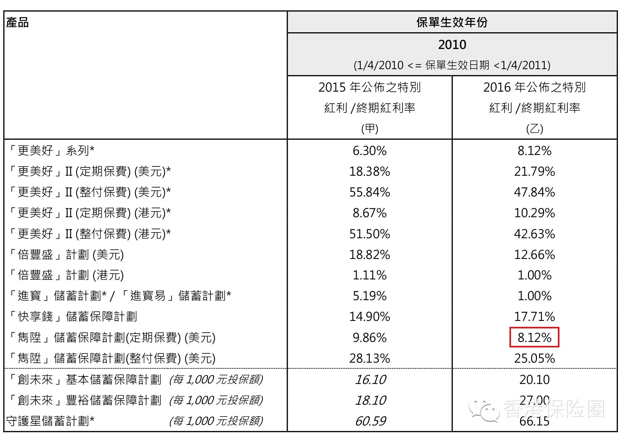 2010年投保的隽升储蓄保障计划,2015年公布之特别红利率是9.86%,2016年公布之特别红利率是8.12%。虽说降低了1.74%,但是是超过预期收益的。