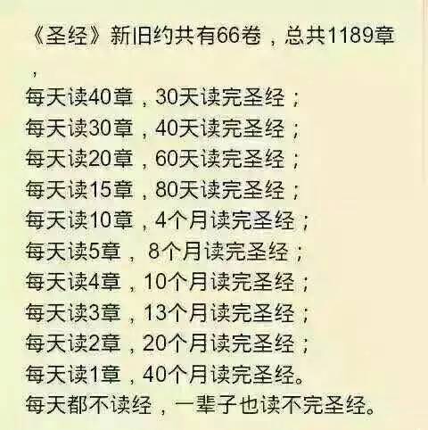2)。尽管全群没有一个统一的计划。但是全群应该有几个“标准化的计划”供大家选择。比如三个月读完一遍的(新旧约共有1189章,每天大概读13~14章);半年读一遍(每天七章);一年读一遍的(每天3~4章,可以长的三章,短的四章)。如果要慢一点,一年半(每天2~3章);两年(1~2章)。