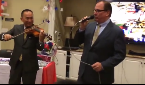 2. 5/16/2014 美国加州共和党参议院领袖Bob Huff参议员在南加州The Orange Club举办的助选筹款晚会上,用中文演唱《月亮代表我的心》、《爱拼才会赢》。他的声乐老师应是他的美丽太太何美湄Mei Mei女士,小提琴伴奏是多才多艺的加州从政之星—郭宗政 Peter Kuo(加州参议员第10选区候选人)(手机录像Julia):