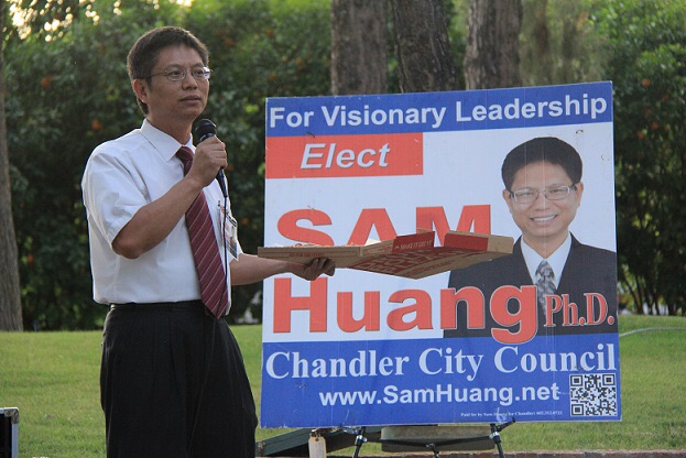 Sam Huang曾于12、14年两度竞选Chandler 市议员,没有成功。今年是第三次,志在必得。