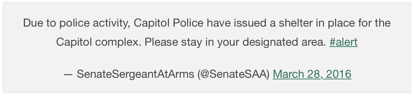一名国会大厦的警察中枪,所幸伤势不严重。枪手已经被抓。事发地点据称为国会大厦的访客中心。目前,并未发现对公众的其它威胁。