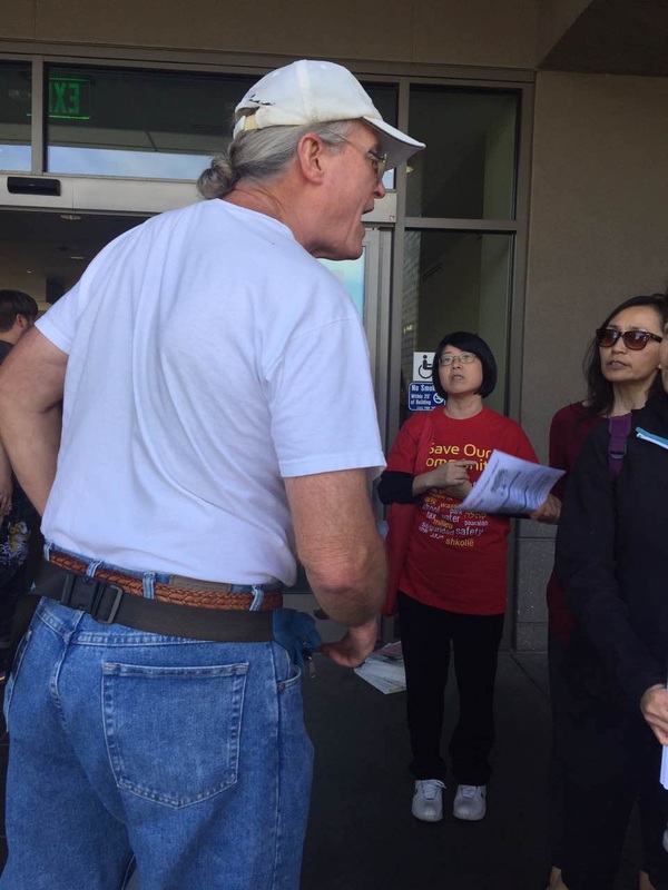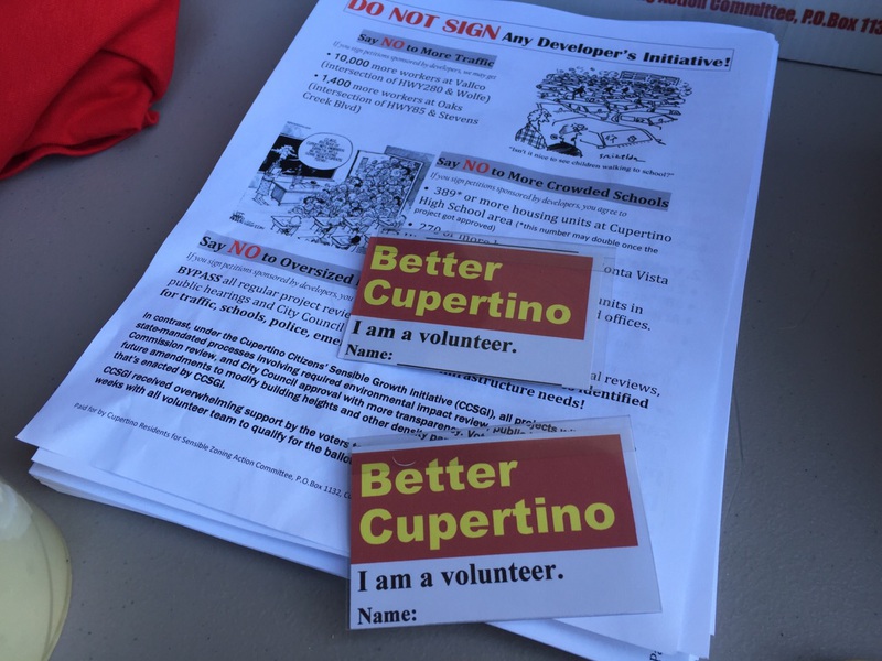 事情起因大致如下。自从库市开发商打出开发商公投,Better Cupertino市民组织就开始在全市范围内组织义工教育民众,不要支持开发商公投。因为我们的CCSGI还权于民公投已经可以上选票,让大家拥有对这些开发商项目投票Say No的权力。因此完全没有必要再给开发商提案去签名。而且,同一个城市,几个开发商签名同时出现,令市民混淆提案,最后整死市民公投的例子,在好些城市都发生过。为了防止CCSGI公投被开发商公投干扰投票,义工们正在坚守第一道防线,到处教育市民不要签名。