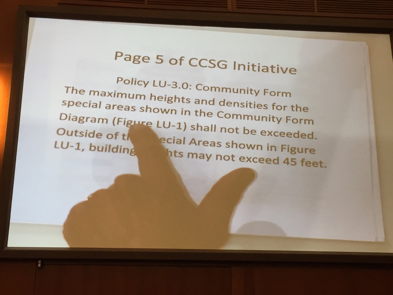CCSGI被攻击的原因,就是公投里面那句,库市城建May not exceed 45ft。所有楼高超过45ft以上的改动,未来都要经过人民公投。而45ft以下的楼高规定改动,跟现在一样归市议会决定。这句话怎么看都是限制楼高的句子,可是在上周四3/31,市府会议上就几次有人想把CCSGI描述成一个提高全市居民楼高50%的提案,只因为现在库市大部分居民区楼高限制为30ft。当时,市议员Darcy Paul帮着律师一个字一个字在现场抠字眼,最后得出来的结论是,CCSGI will not increase anything! 因为may not exceed 45ft的意思是小于等于,与过去居民区30ft的楼高限制毫无矛盾。30ft到45ft这中间的政策制定,跟过去一样,权力都归市议会。Darcy再三确认,市议会才拥有对30ft到45ft的改动权,而不是CCSGI拥有这个提升高度的权力,对不对?律师回答,是的。所以,那天会议最后结果,市府没有把对CCSGI的抹黑内容加入选票。