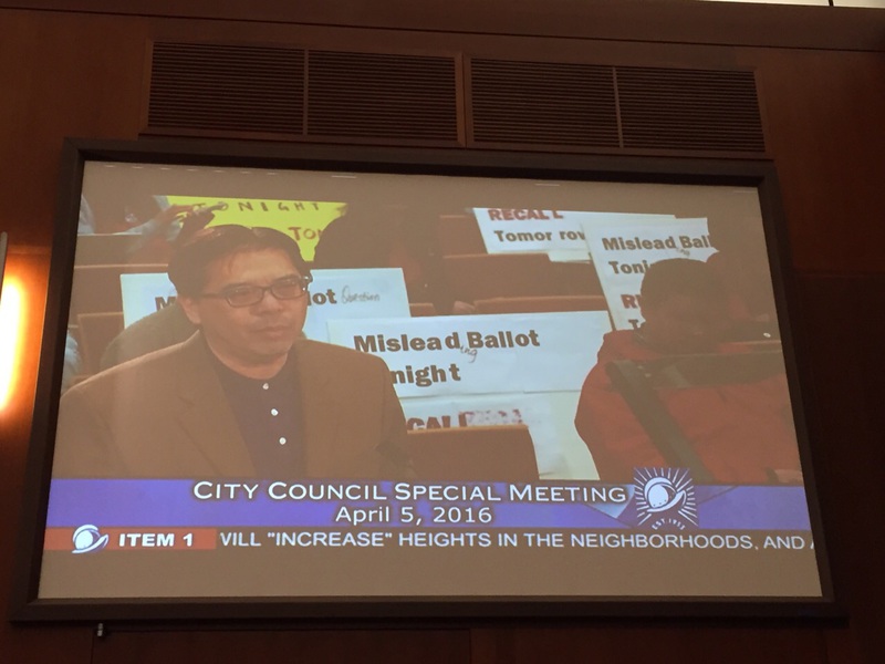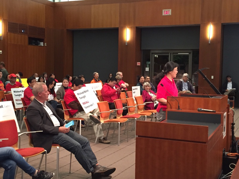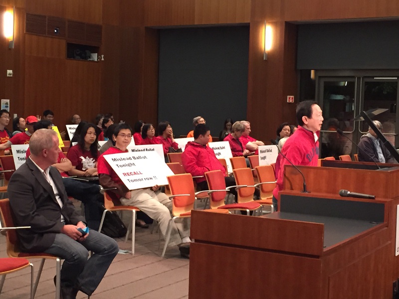 昨晚的市议会争论话题太过激烈,市府方也专门请了自己的亲友团站台发言。亲友团占据了第一排第二排座位,后面的几十名观众,基本全部是支持Better Cupertino,支持市民公投CCSGI的市民。他们几乎人手一个recall施压抗议牌:Mislead Ballot Tonight, RECALL Tomorrow!