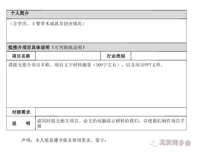 请您于2016年5月 31日前将填写完整的申请表(见附件,可复印使用,并请粘贴电子照片)、项目推介材料包括个人介绍、项目文字介绍、合作意向、项目PPT文件截图、项目视频截图等以传真或电子邮件的形式发送给北京市侨联经济科技部,经我们审核确定后于6月底前向您发出正式邀请函。