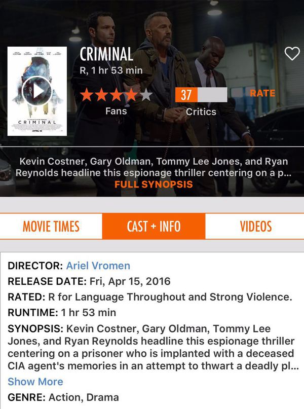 第一部电影:criminal 中文:换脑行动。主角:凯文 柯斯纳,莱恩雷诺斯,汤米李琼斯,都是戏骨,再加上离奇的剧情,最顶尖的cia探员,记忆却植入了极恶罪犯的脑袋中,冲突的两个记忆塞入一个脑袋,过去左右现实,结果却制造了奇迹。说一下感想:本来到影院早了,准备只是看一会儿,就离开,越看越精彩,越看越爱看,索性留下来看完,有时间再重新看一遍。绝对的精彩,绝对值得至少看两遍。我虽然一开始就认出凯文来了,可是,他实在是太憔悴,太老了。气质当然还是那么帅,根据剧情的需要,一看就是一个罪犯,但是时间是一把杀猪刀呀!!演技当然没说的,两个人格被完美的演绎,冲突不断,剧情离奇。有意思。