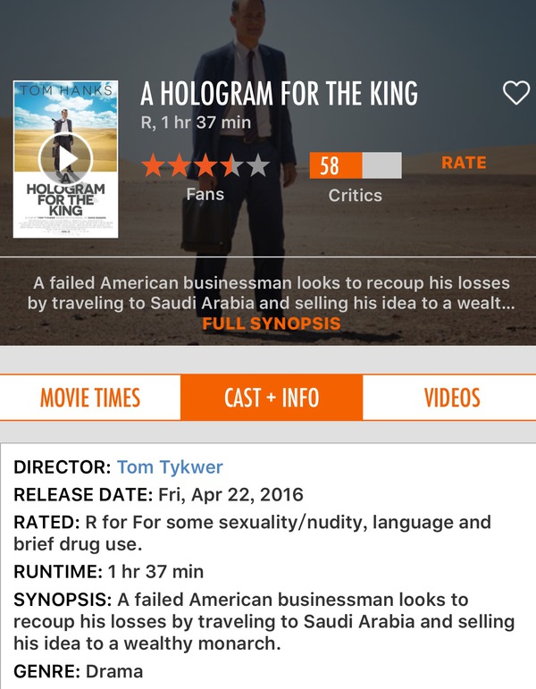 第三部电影:a hologram for the king 中文名字;国王的全息图。主演:汤姆汉克斯。值得一提的是,这本同名小说获得纽约时报2012年度十大好书之一,作者:戴夫埃格斯。当然我的男神汤姆汉克斯主演的片子,一定不俗,这部电影的故事情节颇为有趣,一个美国中年男子为了摆脱债务,试图把一套计算机信息系统卖给沙特阿拉伯国王,由此展开了异国之旅,影片中汤姆汉克斯不同的文化体验,以及和当地人交上了朋友,甚至因为他的出色表现。。。。。哈,我剧透一下哈,他在剧末说:“他没有完成销售的任务,是因为输给了中国商人,中国人用更加快速的软件,一半的价格,成功的得到了生意”,真有意思,看来,很多美国人都把中国商人做为了劲敌。剧情离奇,结局真的大跌眼镜,这三部影片中,最喜欢的就是这部。值得一看再看。。。