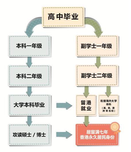 香港政府的政策上规定只要在香港满7年,便可以拥有香港永久居民身份证。香港永久居民享有许多好处,比如免费医疗的福利,可以申请家人来港定居,而且香港税率也很低。最重要的是,香港永久居民可以去全球140多国家和地区免签证,这无论是将来旅游还是办事都非常方便。在港读完4年后,只需在港工作3年便可以拿到。