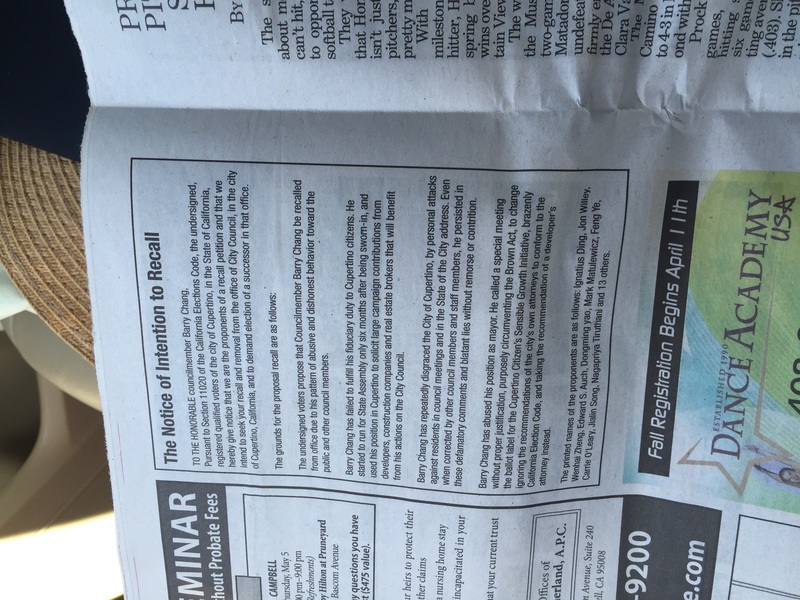 回答:我们的市民组织Better Cupertino奋斗目标是stop uncontrolled growth,另外一个目标就是争取库市还权于民。CCSGI公投就是为了这两个目标提出来的。我们从2014年开始跟市府,开发商,交流,请愿,沟通,抗议无数次,不光毫无成果,对方反而对高密项目越来越纵容,我们才不得不打出CCSGI公投。这跟华人不华人没有关系,我们的目标是保卫自己的家园,自己的城市。公投在4月5日被张市长强行召开,并且强行执行投票的会上被抹黑了,我们反而被抹黑成高密提案发起组织。这种冤屈让人无法容忍才引发recall。并且,义工向记者展示了今天Cupertino Courier上面刊登的罢免通知书。里面有发起人的签名,有白人,有印度人,这跟所谓华人组织互相搞内斗,搞权斗,完全没有关系。