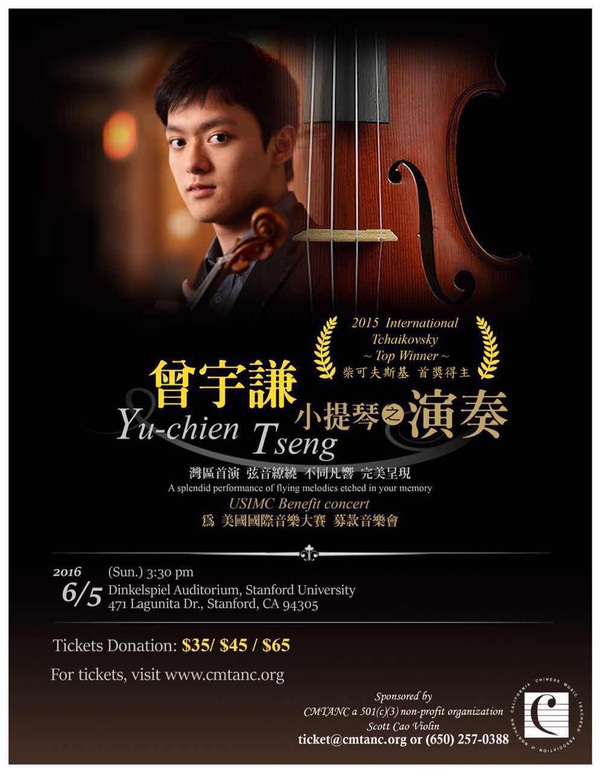 要和大家分享一個好消息! 2015年柴可夫斯基國際比賽小提琴最高獎得主-曾宇謙將來灣區舉辦獨奏音樂會。