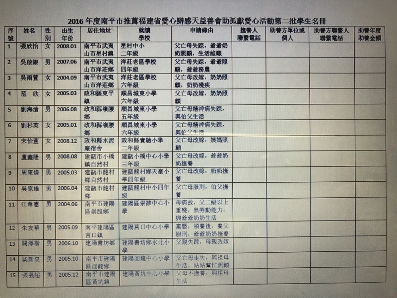 助養人對受助者的支援務必到他她們18週歲止,初中及小學生每年每位助養費1200.00人民幣起,高中生每年每位助養費2000.00人民幣起。當然,平時大家還可與他們聯繫、關懷、與個人增援,或過年過節,或善款,或衣著,也可由您們自己轉帳,或交給他們哦!但為了保護孩子的身心健康與安全,務必先告訴我們,由福建省愛心辦協助您們。