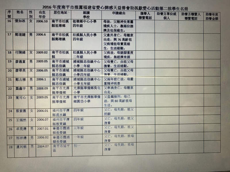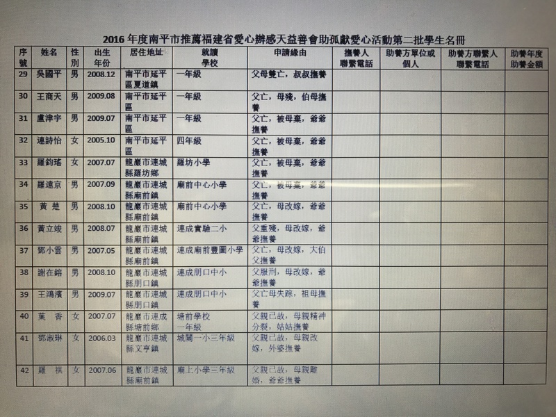 據不完全統計,全國有近58萬,就福建省有1600位以上「事實無人撫養兒童」,他們的生活與學習不僅享受不到監護人的照顧,有些孩子還要承擔照顧患重病的爺爺奶奶和因身體髙度殘疾、喪失勞動生活能力的父母的責任,度日艱辛,肩挑重擔。他們不是理論上的孤兒,無法納入孤兒保障體系,但事實上,與孤兒相比,他們面臨同樣、甚至更嚴峻的生存難題。