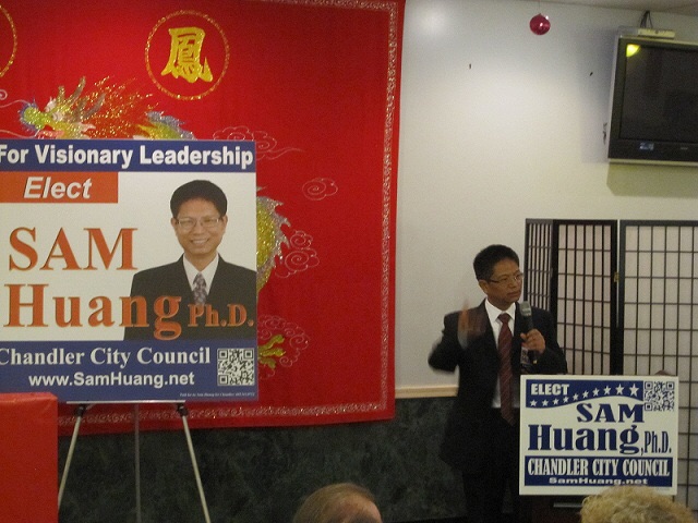 3. 目前Chandler 有將近十三萬的登記選民,華人登記選民不到四百人。八月份的選舉,一般只有二萬七千人投票。Sam Huang需要至少一萬二千票才能當選,我們需要請你集中選票,支持最好的、也是全亞歷桑那唯一的華人市議員候選人Sam Huang。
